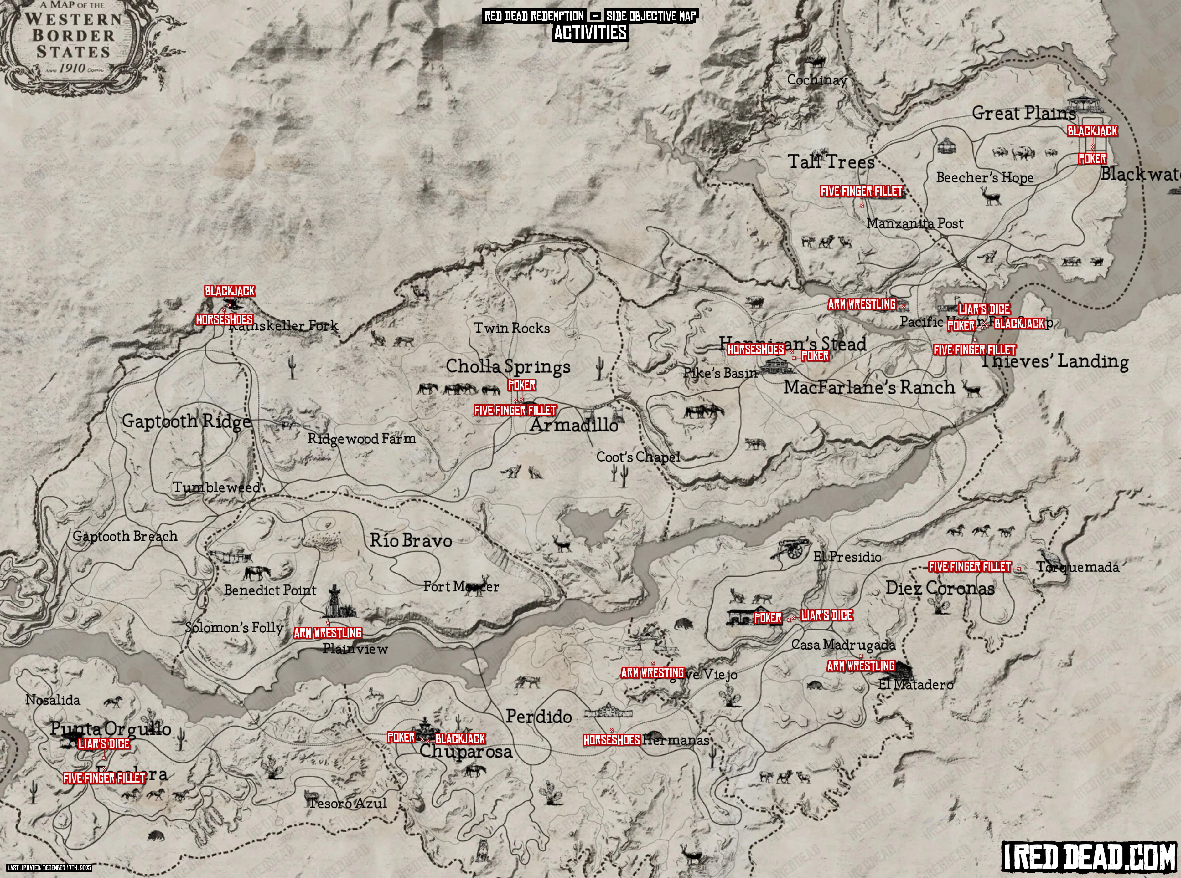 You're able to take part in minigames in most of the towns in Red Dead Redemption. There are 6 specific activities which must be completed if you're going for 100% completion, although some specific activities also unlock outfit scraps.