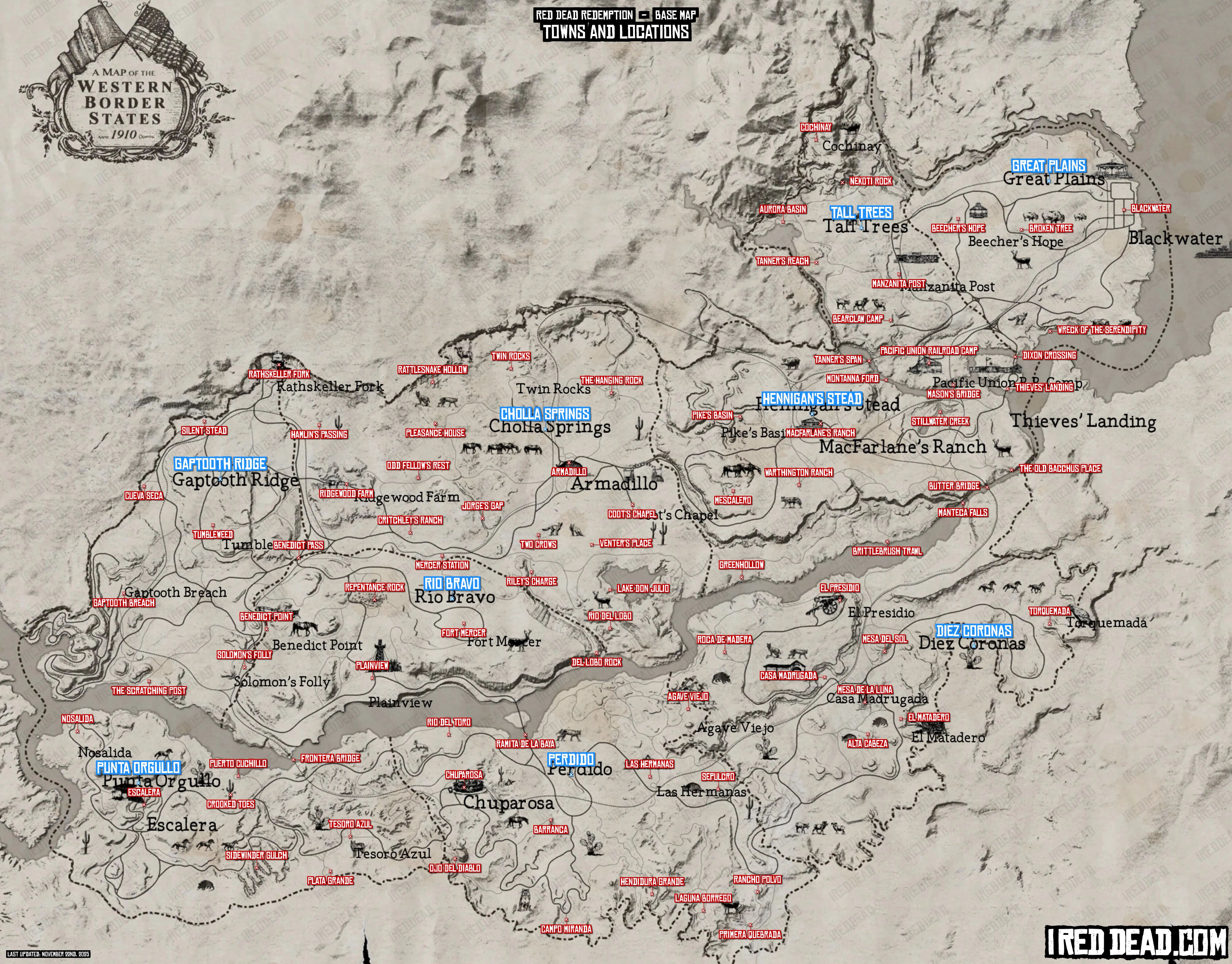 There are 9 counties in Red Dead Redemption which are displayed on the map from the start of the game. Once you visit a location inside them, they're usually checked off. There are 85 actual locations to visit in addition to the 9 counties and they'll be marked on your map when you get within a short distance of them.