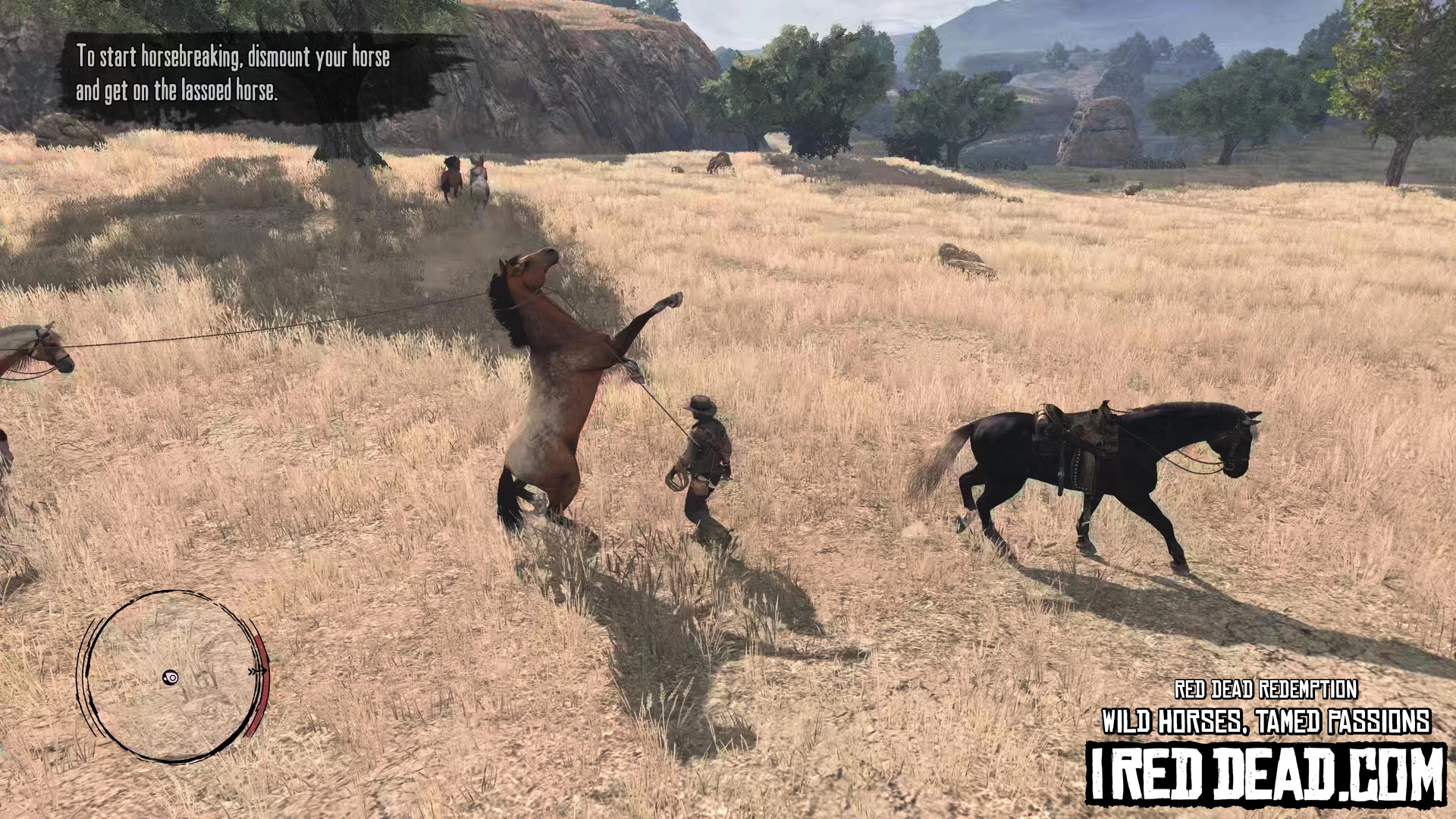 You're then told "To start horsebreaking, dismount your horse and get on the lassoed horse". Keep holding L2 as you quickly make your way towards it. The faster you get there, the better or it can end up breaking free or knocking you over. You can hold the R1 button to restrain the horse and prevent it from bolting, but the best course of action is to get off your horse as close as you can to the lassoed horse and mash Triangle to get straight onto the new horse.