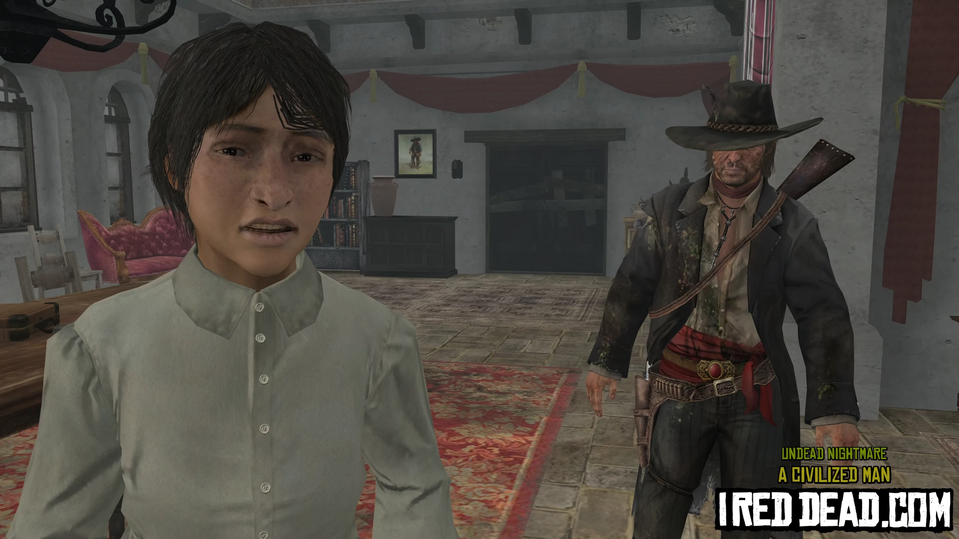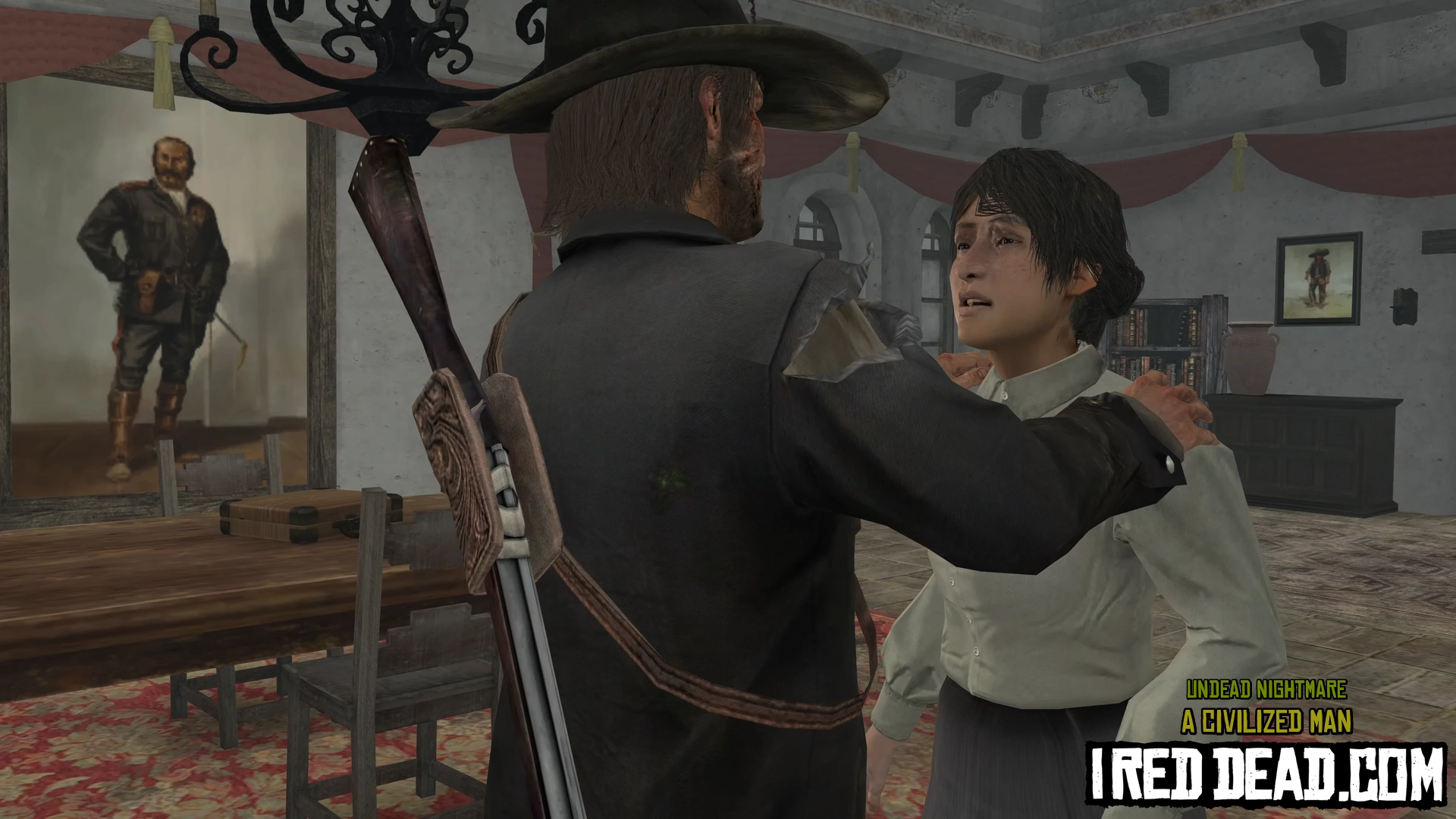 She points him up the stairs into the mansion. Inside a young woman is being chased around a table by a noticeably zombified Reyes.