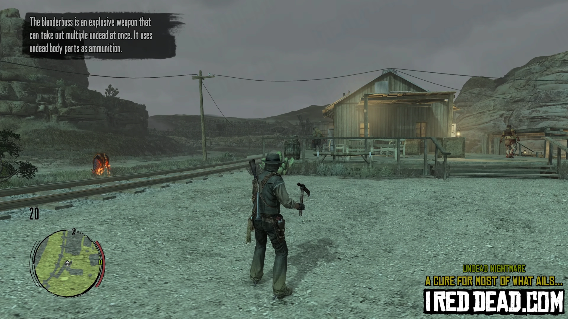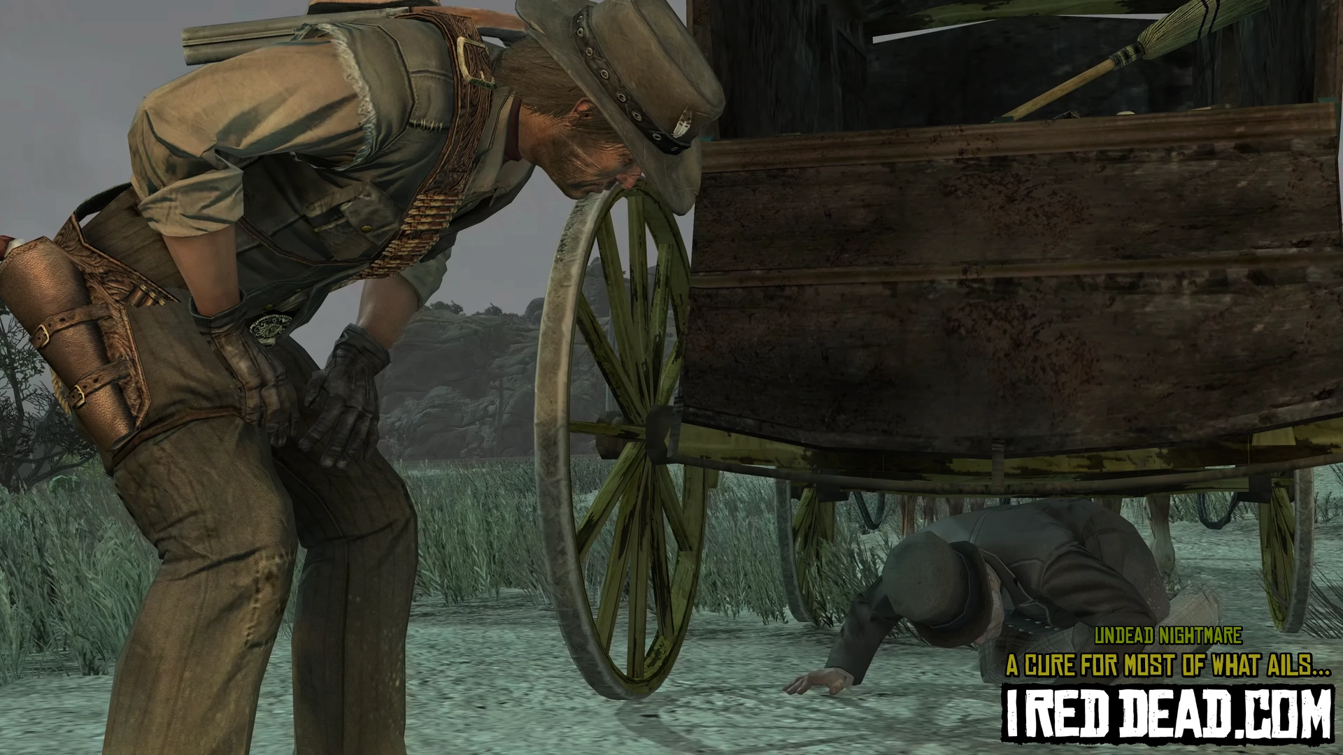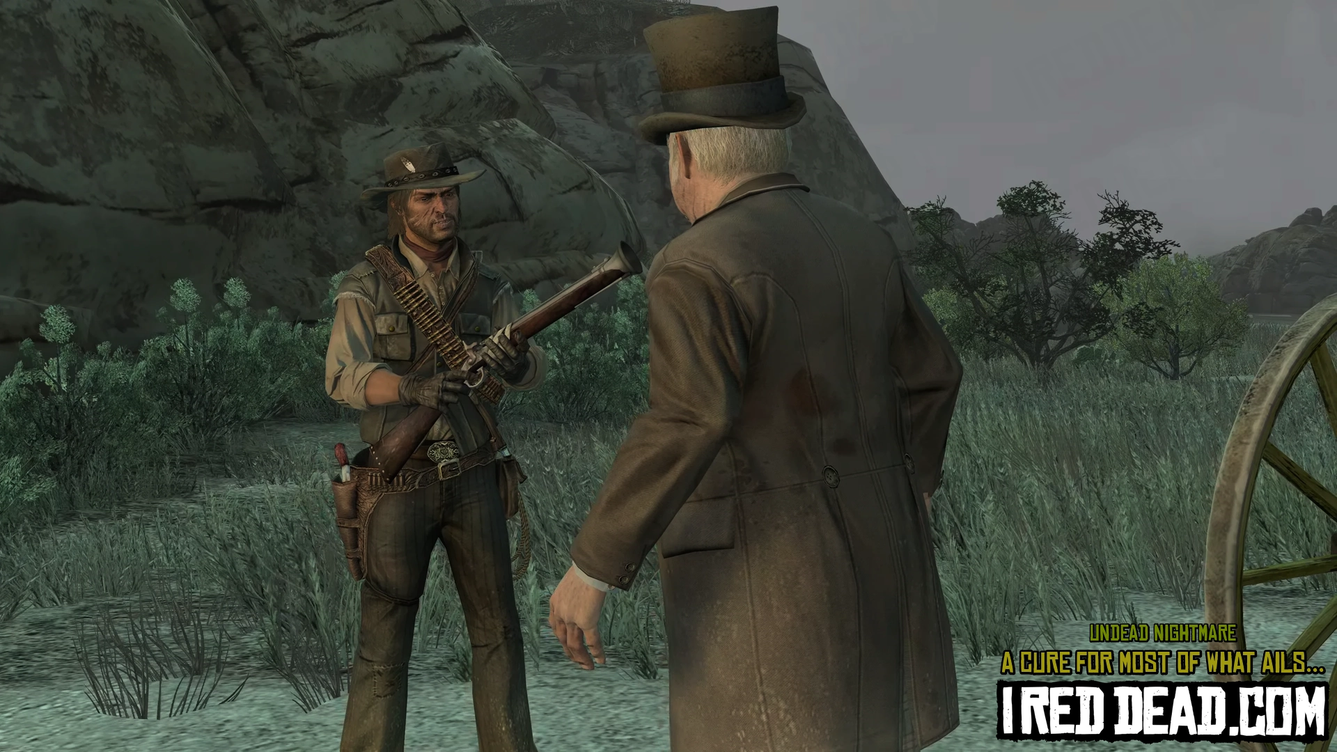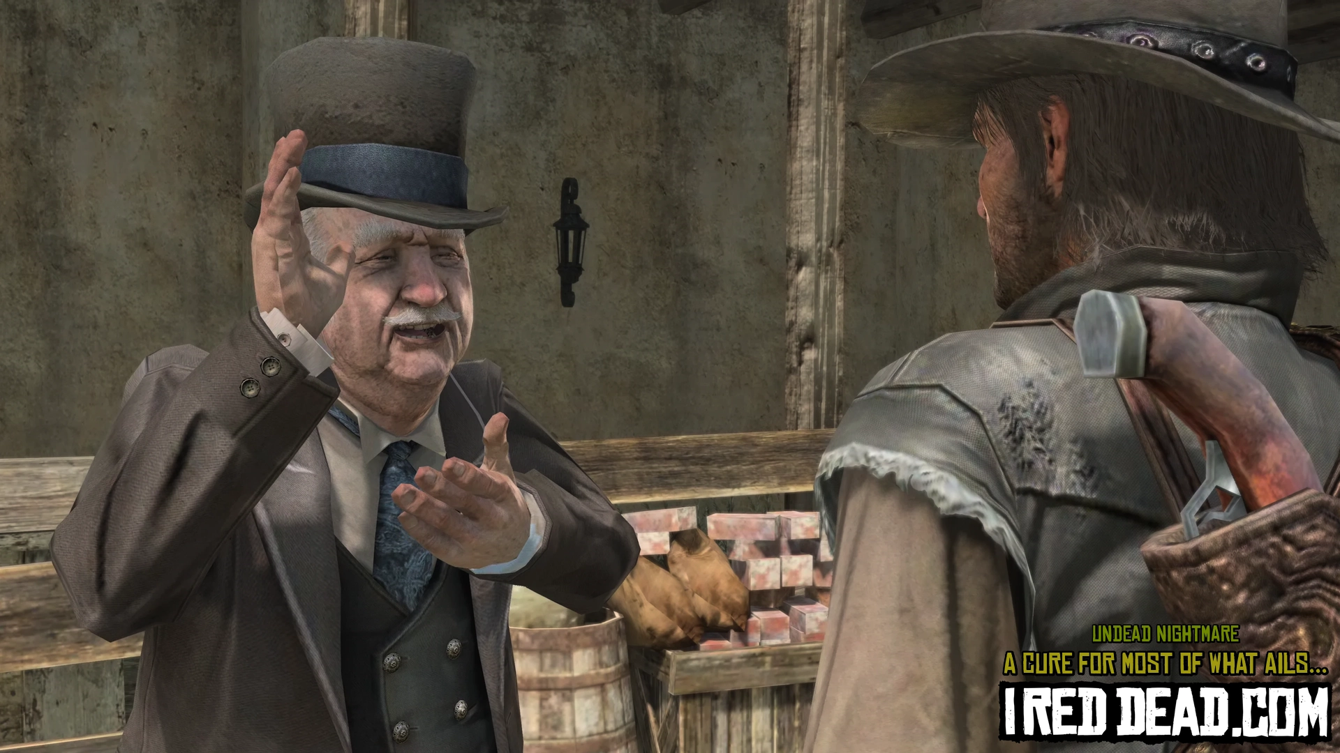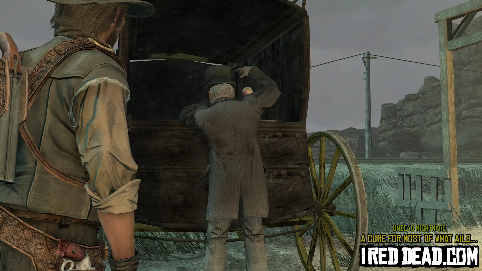 Not wanting a noose around his neck, Nigel is heading to Mexico where things are supposedly better. John hands over the gun parts and Nigel trades over a Blunderbuss after rummaging around in the back of his stagecoach.
