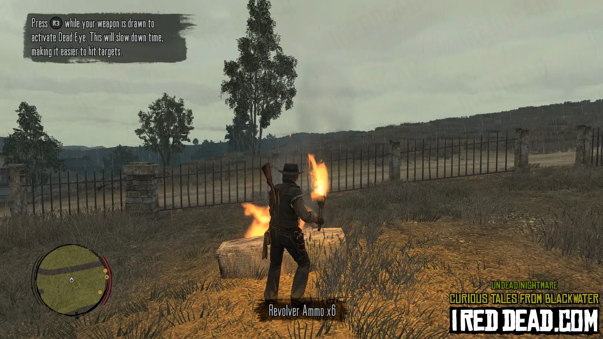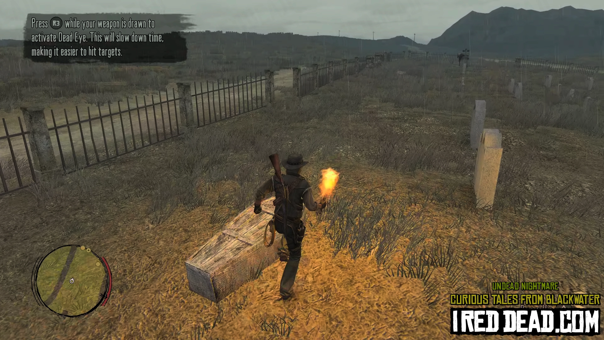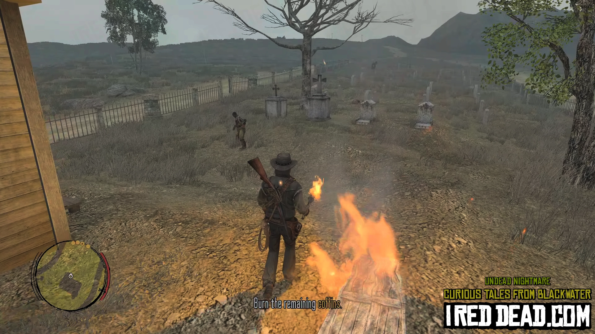 - For cemetery clearing, the order of burning the coffins does not matter. Use your torch to fend off enemies as much as possible to save ammo and Dead-Eye. A good trick is to have the zombies chase you past a burning coffin so they ignite and slowly lose health before dropping to the ground. Like the torch, they might need to be reignited a second time to finish the job. This works for the "boss" zombie as well. The gravestones make good obstacles for you to run around and gain distance from the zombies.