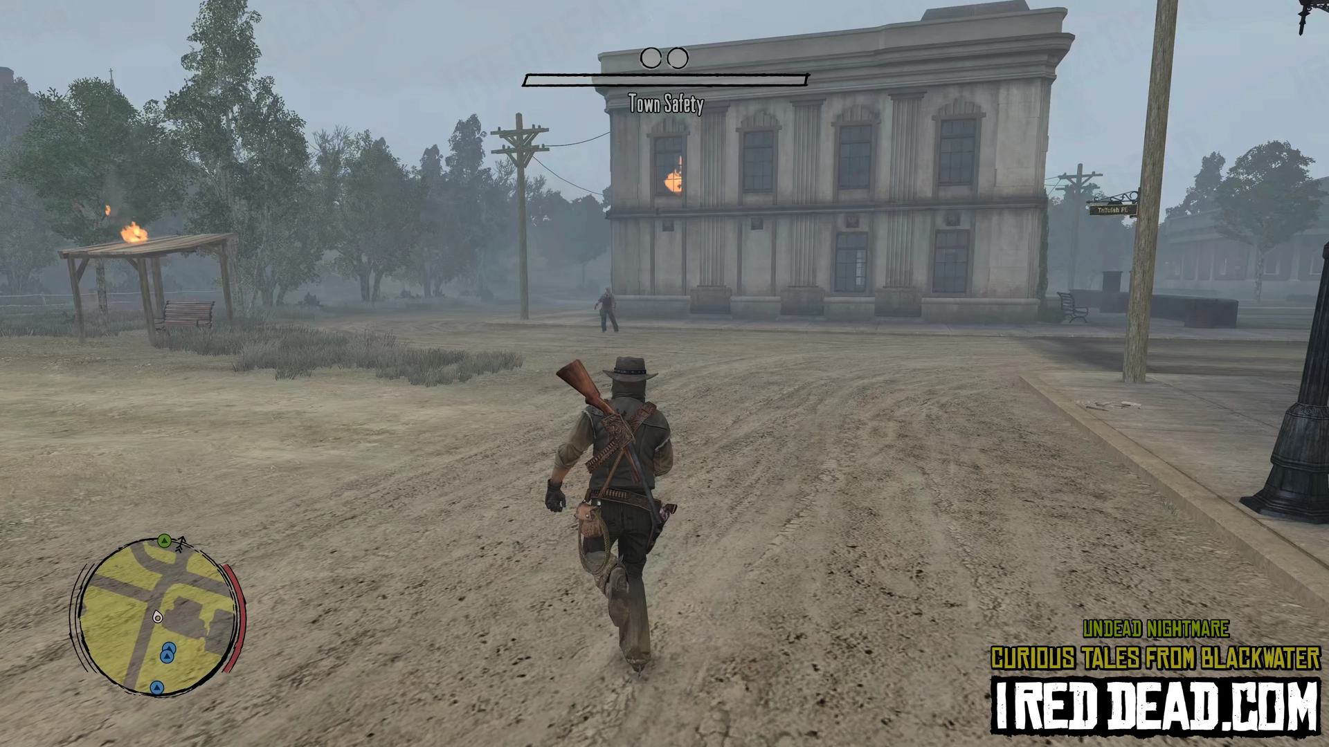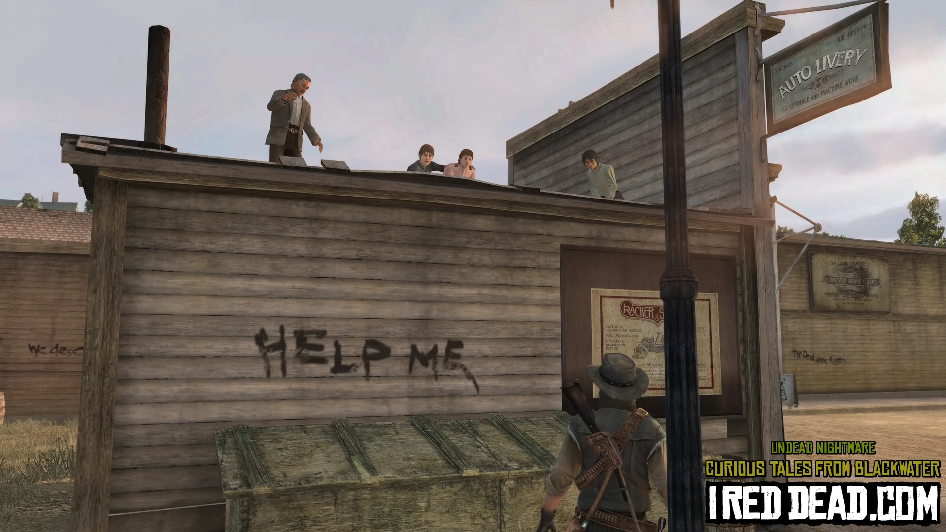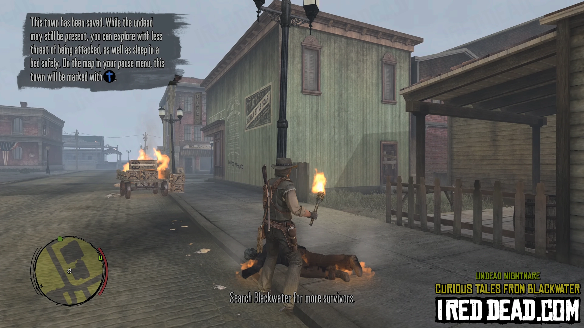 In the pause menu map you will notice a hand icon representing the status of the town as "Under Attack". As you re-enter Blackwater gun shots are heard and a cinematic shows survivors on a rooftop yelling for help. You are instructed to help them lessen the undead presence in order to sleep here and explore more easily.