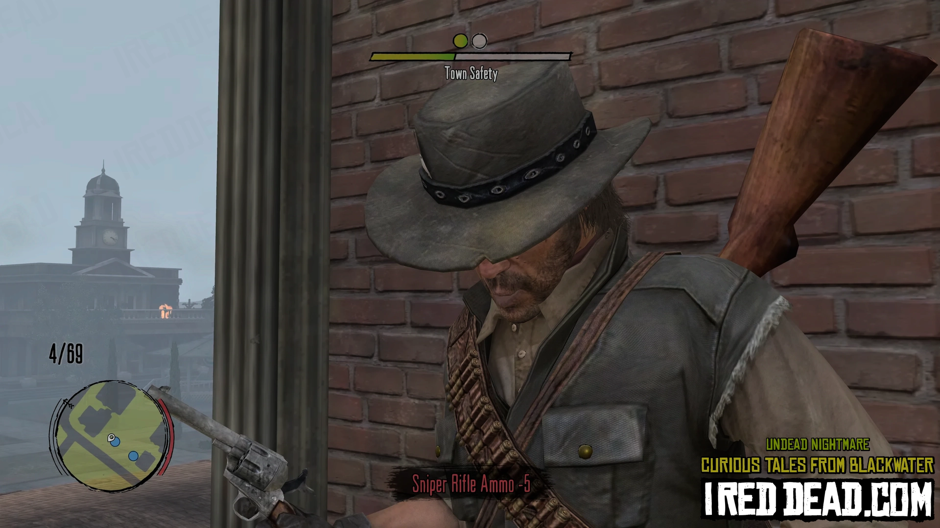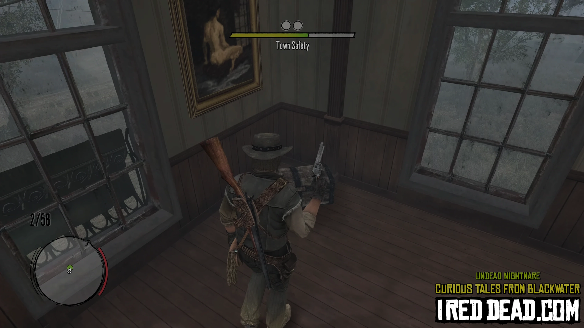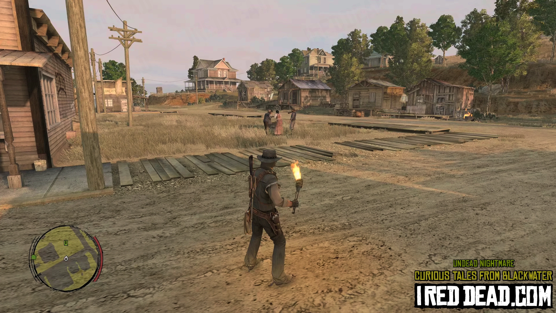 In the pause menu map you will notice a hand icon representing the status of the town as "Under Attack". As you re-enter Blackwater gun shots are heard and a cinematic shows survivors on a rooftop yelling for help. You are instructed to help them lessen the undead presence in order to sleep here and explore more easily.