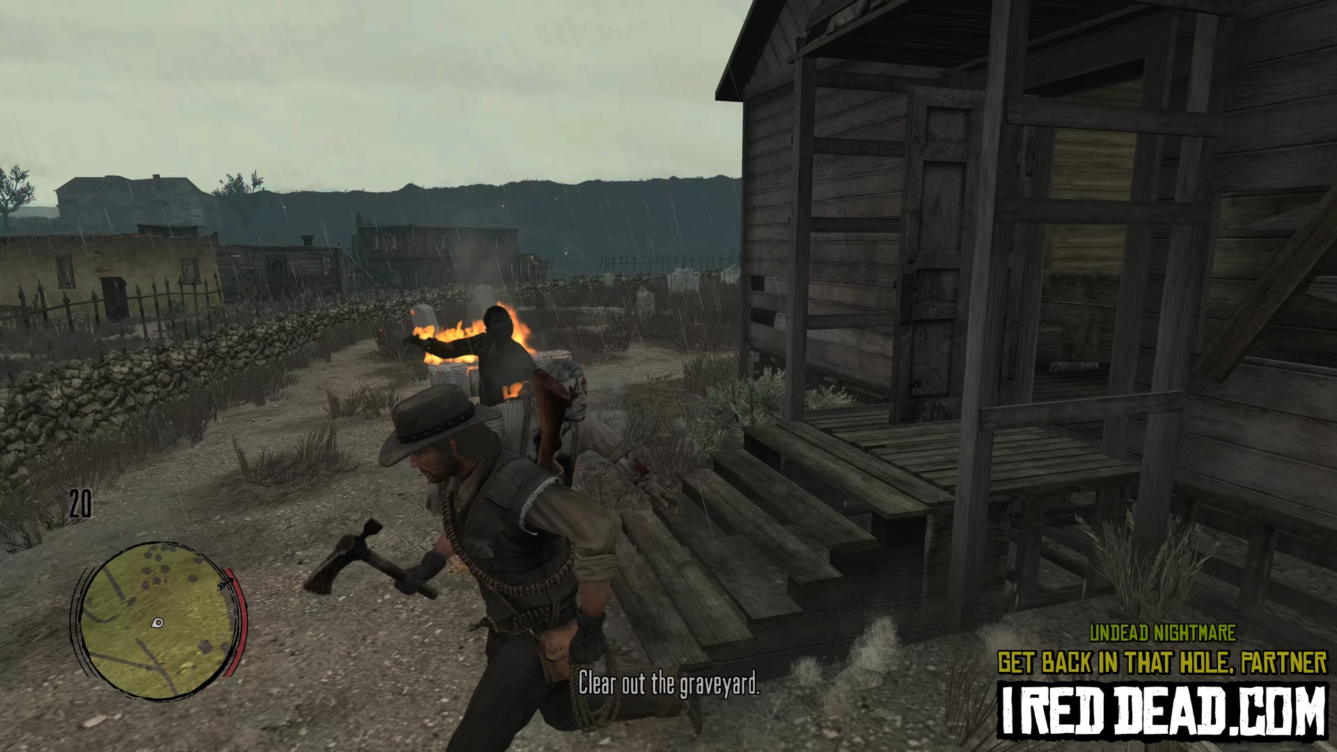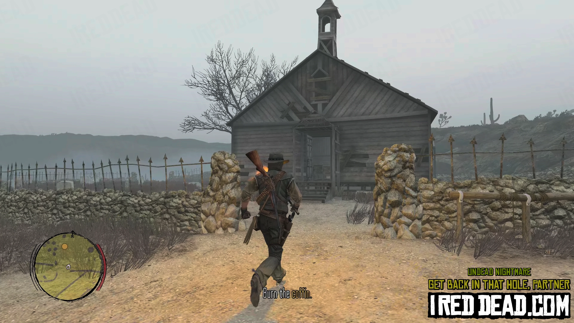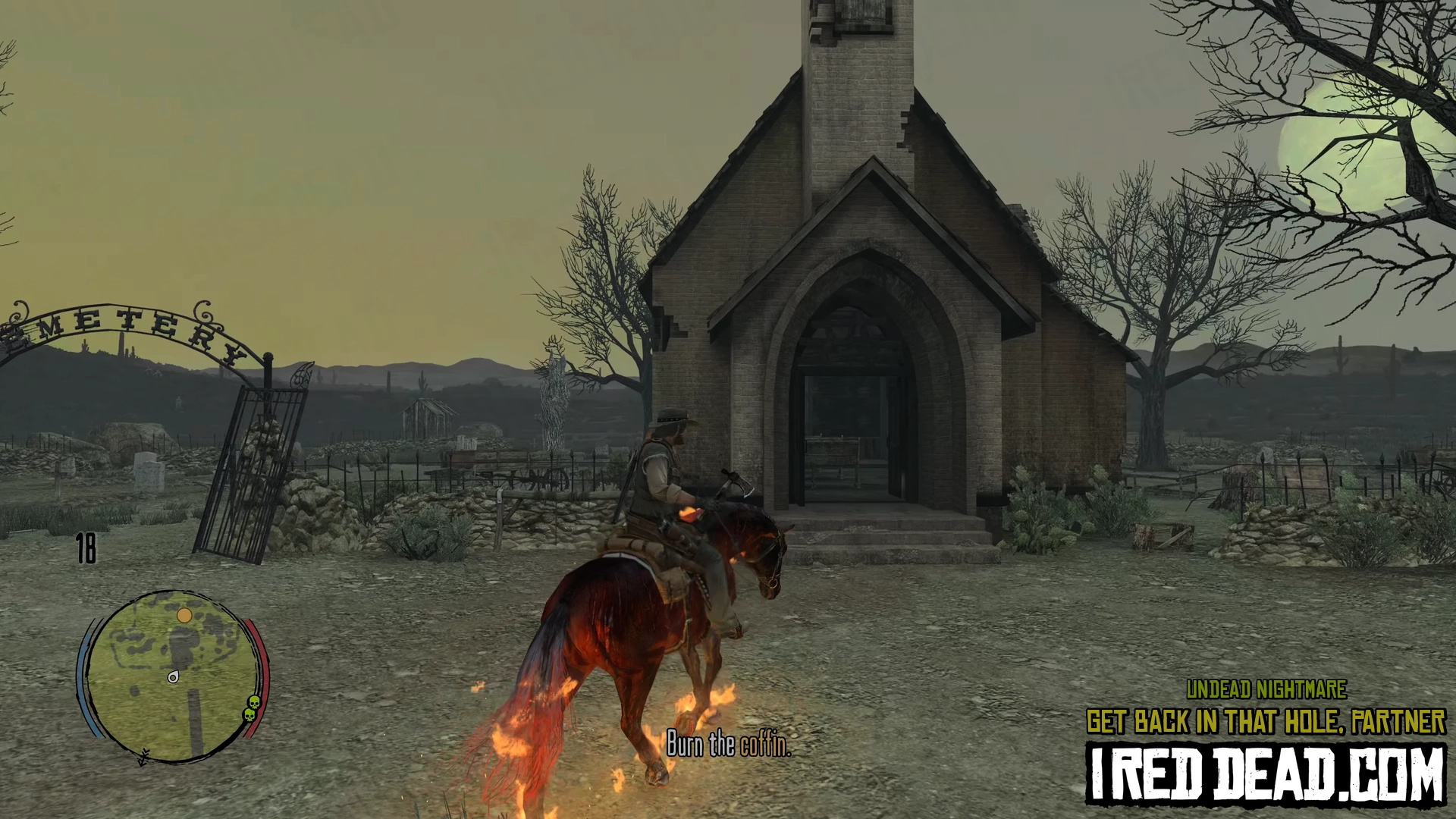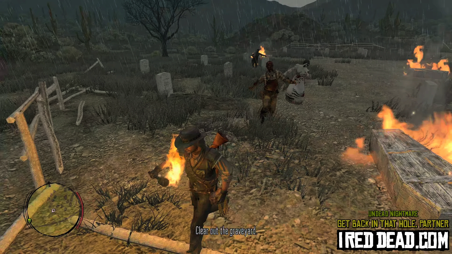 Approach the area and burn the first coffin to start the cemetery clearing minigame. As the dead rise send them back to the underworld while trying to burn the other coffins marked on your radar. Each coffin yields ammo. Remember to always aim for the head and conserve Dead-Eye. When you get near the end, the "boss" zombie for the cemetery will appear. Kill it and the remaining zombies to complete the minigame.