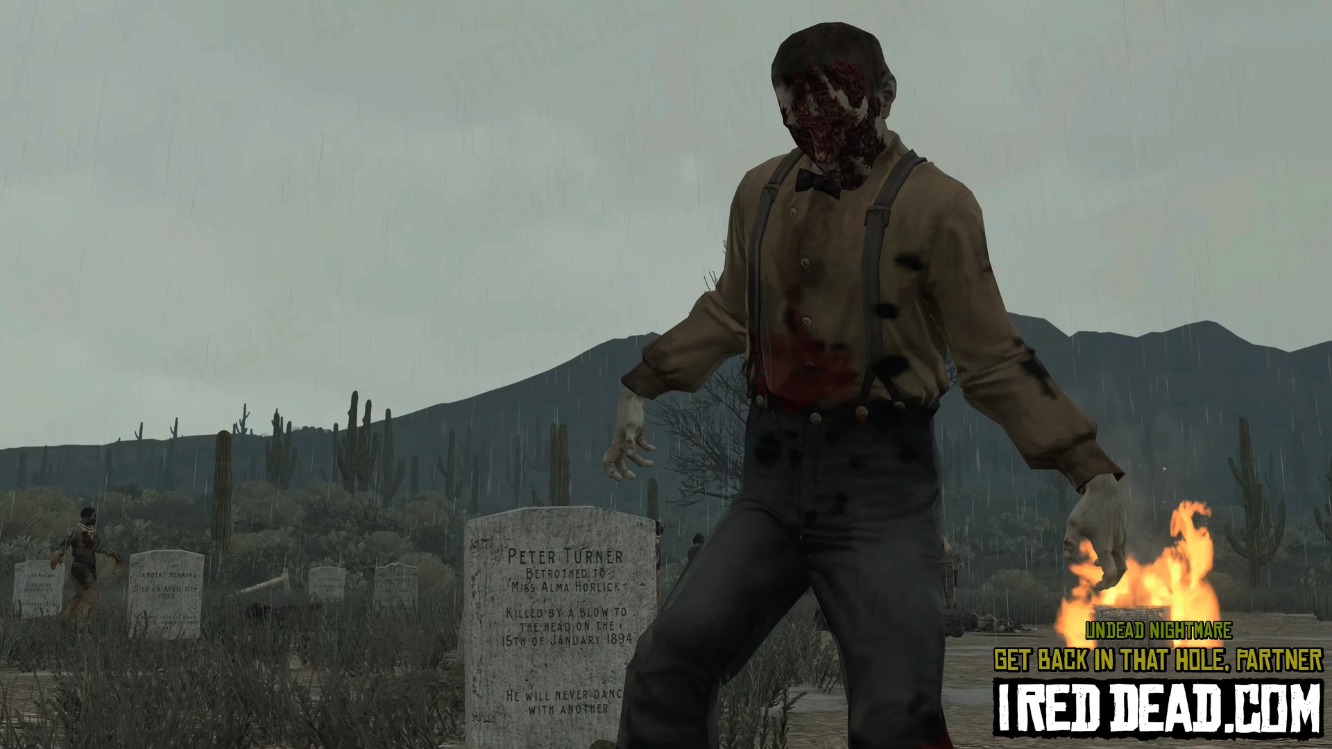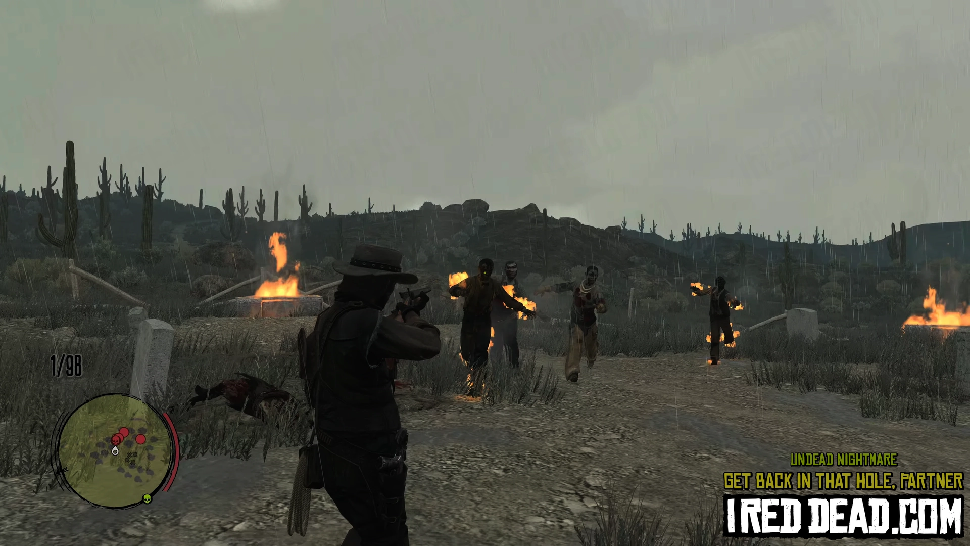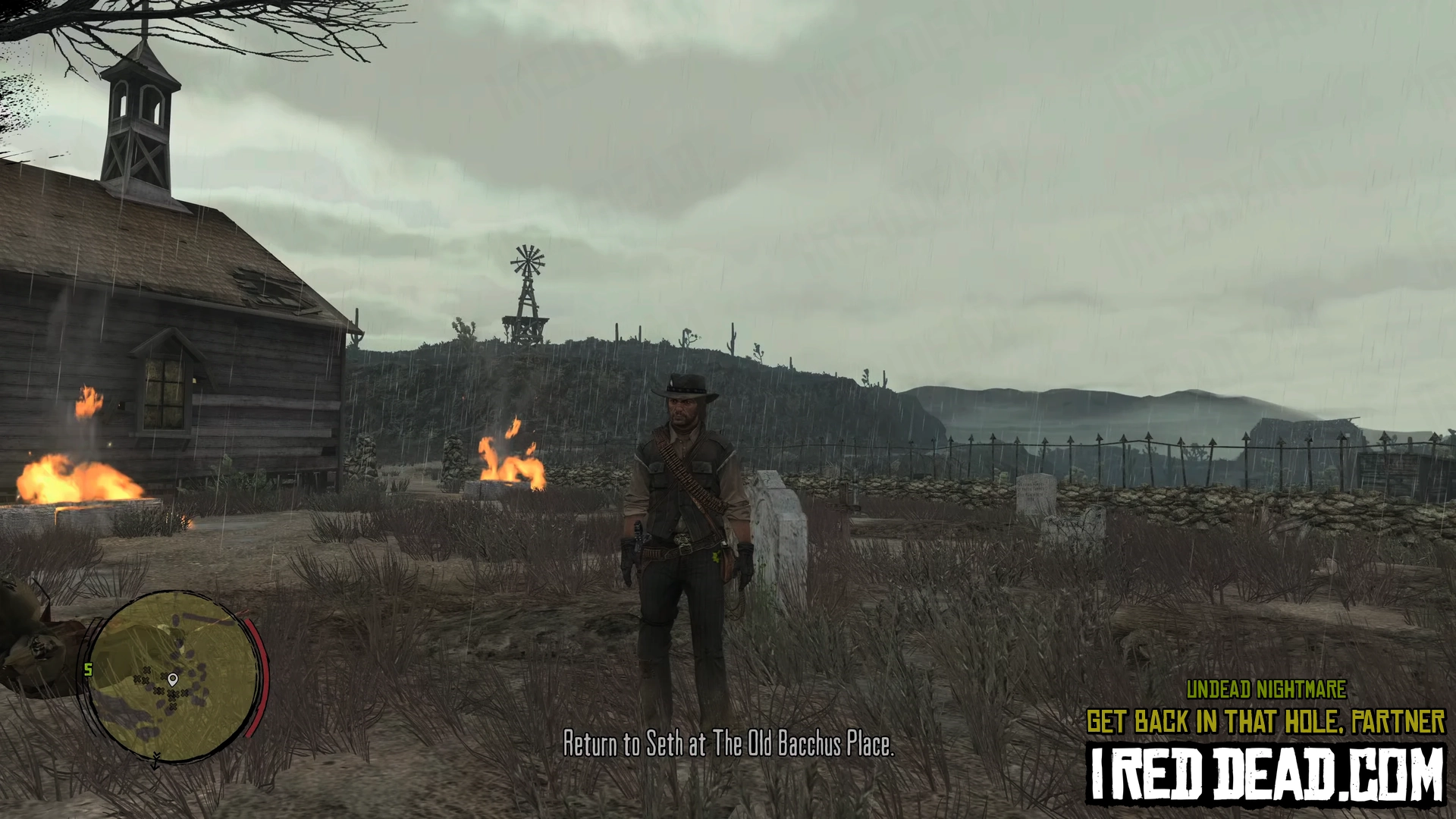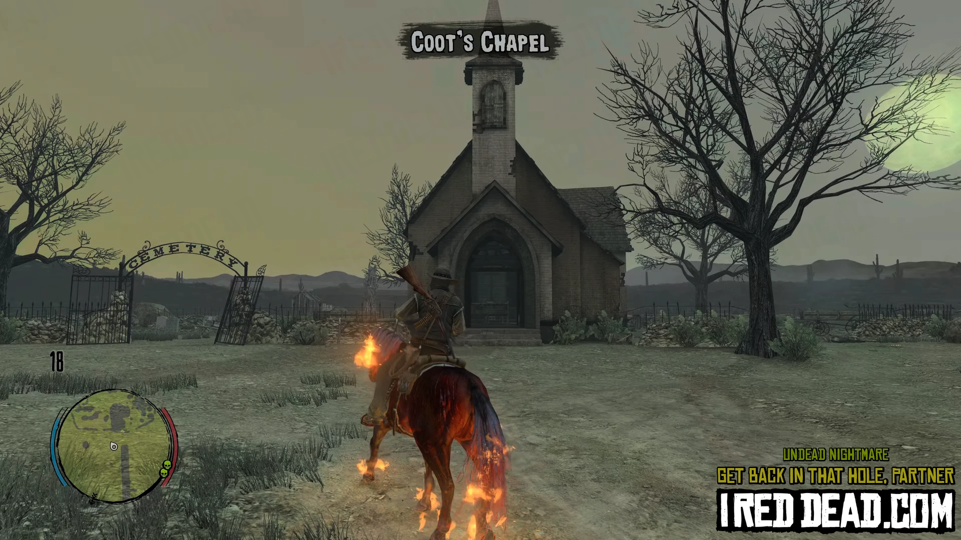 Approach the area and burn the first coffin to start the cemetery clearing minigame. As the dead rise send them back to the underworld while trying to burn the other coffins marked on your radar. Each coffin yields ammo. Remember to always aim for the head and conserve Dead-Eye. When you get near the end, the "boss" zombie for the cemetery will appear. Kill it and the remaining zombies to complete the minigame.