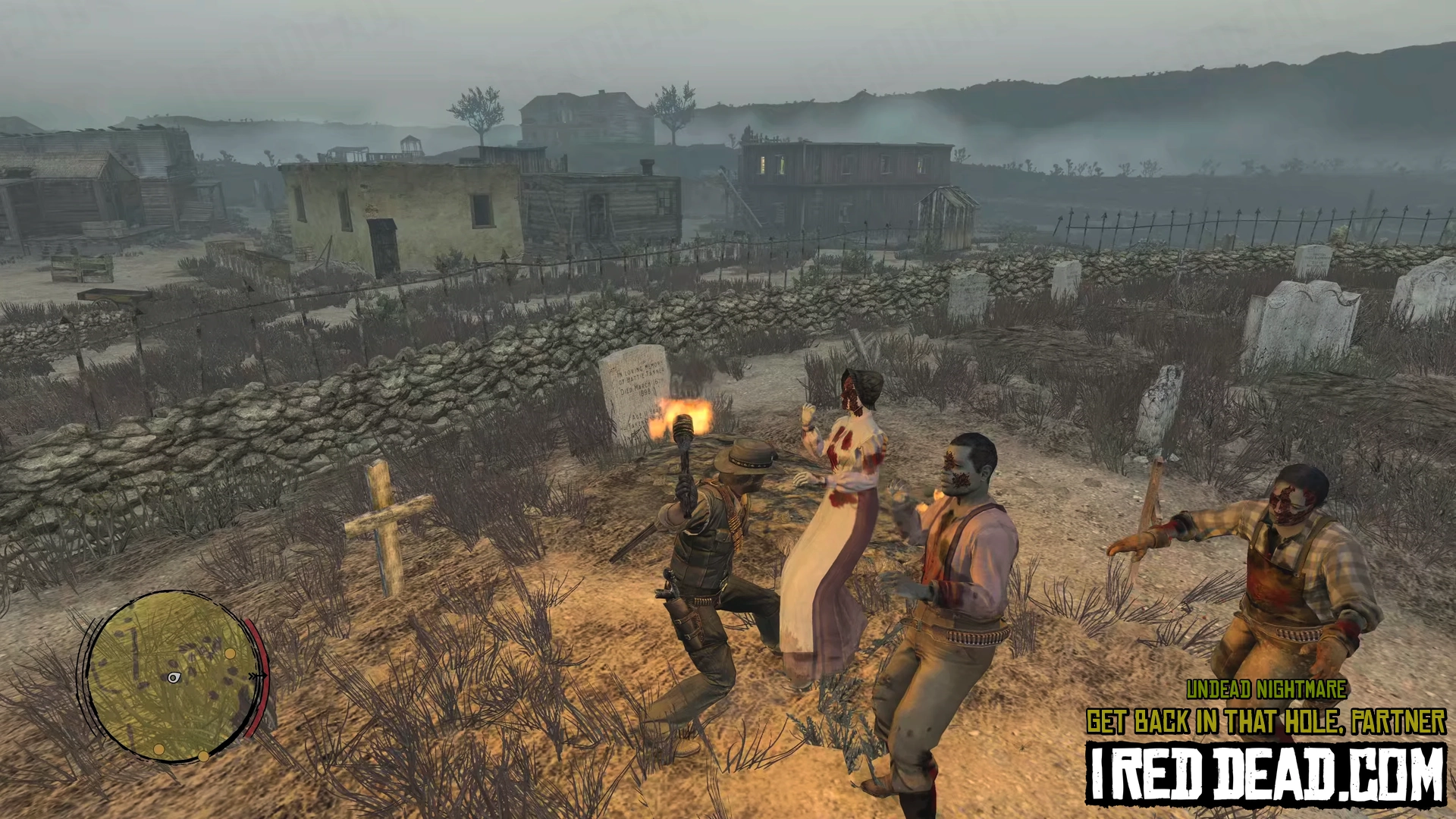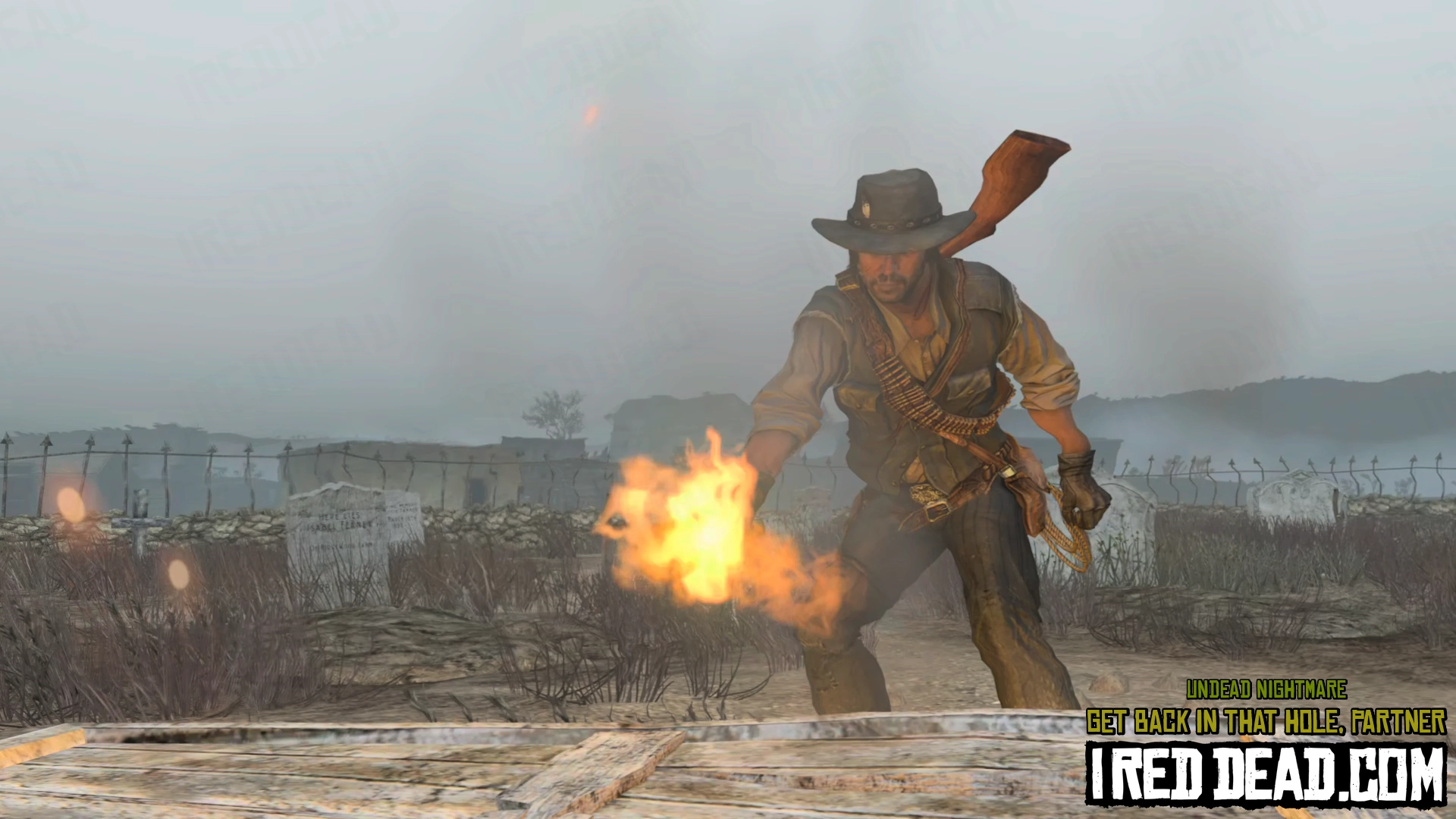 - For cemetery clearing, use your torch to fend off enemies as much as possible to save ammo and Dead-Eye. A good trick is to have the zombies chase you past a burning coffin so they ignite and slowly lose health before dropping to the ground. This works for the "boss" zombie as well. The gravestones make good obstacles for you to run around and gain distance from the zombies. Note that this is a very slow process for the advanced graveyards.